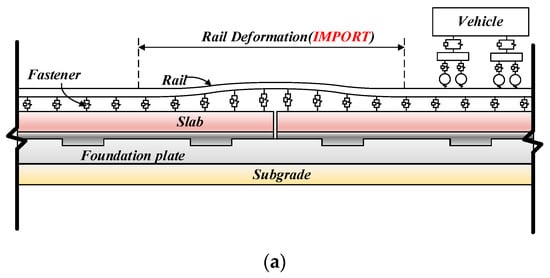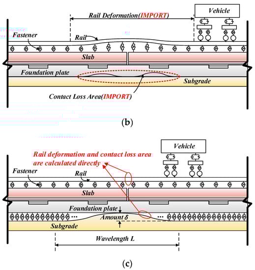 We next present the analytical concept of Model-C (shown in Figure 6). Due to the weak correlation between vehicle loading and frost heave in the time series, the influence of subgrade frost heave deformation on the slab track was calculated as a quasi-static process before the vehicle started running.