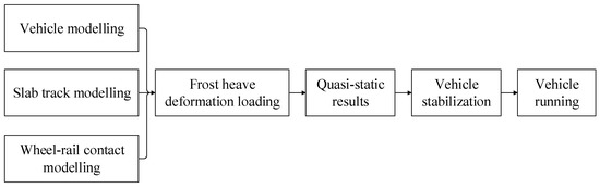 After the frost heave displacement was loaded in the quasi-static process, the vehicle model and the track model were connected by the wheel-rail contact. After the multi-rigid-body vehicle model was stabilized under its own weight, a certain velocity was assigned to the vehicle to calculate the dynamic response of the whole system.