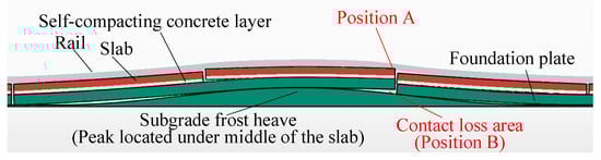 According to previous research, when the wavelength, the amplitude and the crest position of frost heave change, the impact on the ballastless track would also change. For example, when the relationship between the crest location of the upper cosine deformation and slab joint changes, the contact loss area under the foundation plate would be different. In order to clarify the action mechanism of contact loss in the system after frost heave more clearly, and to facilitate the verification of Model-C and the existing study, the condition consistent with the existing study [24] was chosen in this study, whereby the peak position of the upper cosine deformation was located below the quarter of the foundation plate and also the middle of the track slab (as shown in Figure 7).