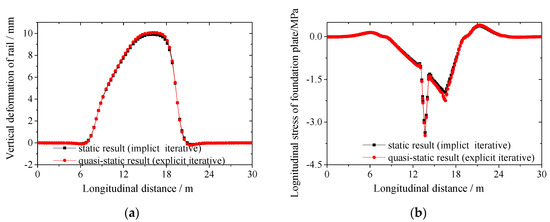 The quasi-static results (with the explicit algorithm in Model-C) and the static results (with the implicit algorithm) of the stress and deformation of the slab track are compared in this section. As a comparative indicator, the vertical deformation of the rail is shown in Figure 8a, and longitudinal stress of the foundation plate, which was impacted directly by subgrade deformation, is shown in Figure 8b.