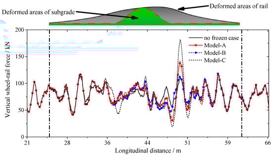 The actual deformation areas of subgrade and rail, which were caused by frost heave, are marked at the top of Figure 10. It can be seen that the deformation of subgrade frost heave results in a wider range of track irregularities. To determine the influence of track irregularity caused by frost heave, the results from Model-A and the no frozen case are compared first.