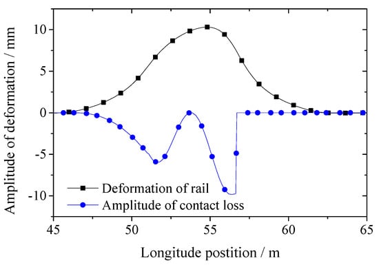 After performing the quasi-static calculation of a subgrade frost heave with a wavelength of 10 m and an amplitude of 10 mm, the deformation of the slab track and the subgrade was determined and is shown in Figure 7. It was demonstrated that the CRTS Ⅲ slab track was raised into a bent state by the subgrade before the next vehicle running step was performed.