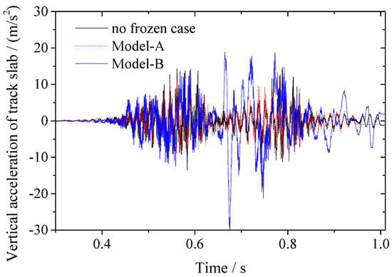 Results from Model-C and other models are compared to determine the influence of initial stress and deformation of slab track caused by frost heave. According to Figure 10, there is also a relatively large difference between the result of Model-C and the other two models. For example, both Model-B and Model-C have taken into account the influence of contact loss area during the calculation; however, the maximum vertical force of Model-C is around 181.74 kN at the time of 0.60 s, which is 30.10% higher than that of Model-B. Moreover, whether the contact loss plays an important role in the difference is debatable.