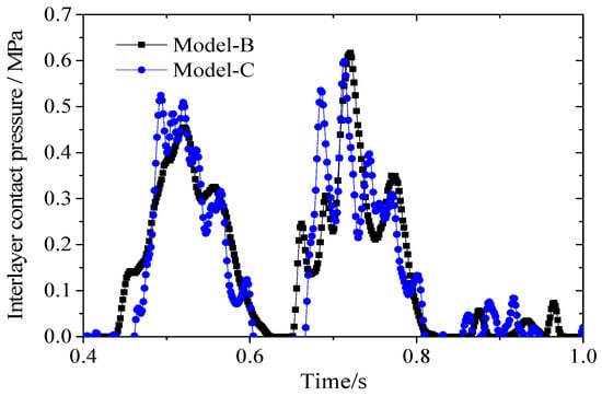 Time history of interlayer contact pressure with Model-B and Model-C.