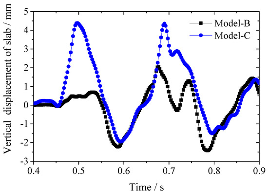 Time history of vertical displacement of track slab with Model-B and Model-C.