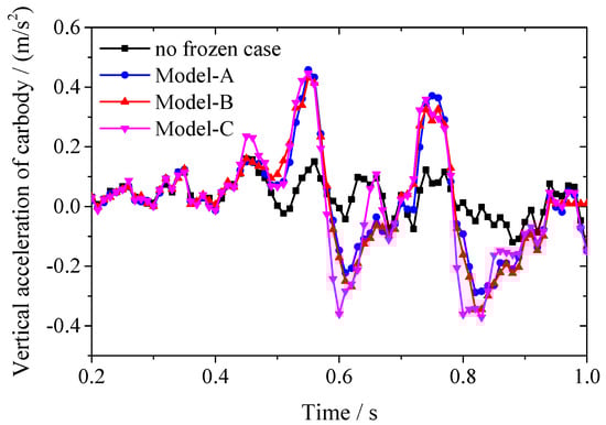 The vertical acceleration of the car body under different cases is shown in Figure 15. Compared with the no frozen case, the vertical acceleration of the car body showed obvious fluctuations after entering the frost heave area. The mode of fluctuation is influenced by the superposition between the dynamic responses of the front and the back bogies, which could also achieve a good agreement with the results in [22,23,24]. However, the results of the three models showed no significant differences in this short-wavelength frost heave condition, which indicates that the short-wave impacted caused by the contact loss area and the leverage effect has been basically eliminated through the transmission of primary and secondary suspensions, while the track irregularity with a longer wavelength becomes the main factor affecting the acceleration of the car body.