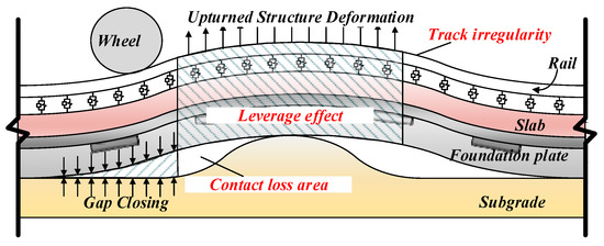 Because the track structure is bent by subgrade, only a small part of the whole foundation plate is supported by the crest of frost heave, and the contact loss area appears in the front and back of the crest, making the slab track more like a lever. When the wheel load compacts the contact loss area in front of the crest, the structure, which is located above the contact loss area in the back of the crest, would appear as an upturned displacement due to the bending stiffness of the track structure. The upturned displacement would be amplified by the bending state of the track slab itself.