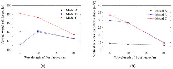 The maximum vertical wheel-rail force of the first wheelset under different wavelengths is shown in Figure 17a. In Model-A and Model-C, the wheel-rail force decreases as the wavelength increases. When the wavelength is 5 m and the amplitude is 10 mm, the vertical force of Model-B is even smaller. This is because the irregularity is covered by the contact loss underneath the foundation plate at the first wheelset. Significantly, only the first wheelset in Model-B shows this phenomenon, and the results of other wheelsets in Model-B are similar to those of the other two models. As the wavelength increases, the differences between the results of the three models become more and more similar. For example, the maximum wheel-rail force of Model-B is 20.82% less than that of Model-A and 46.22% less than that of Model-C when the wavelength is 5 m. When the wavelength is 20 m, the result of Model-B is 6.90% less than that of Model-C and almost the same as that of Model-A.
