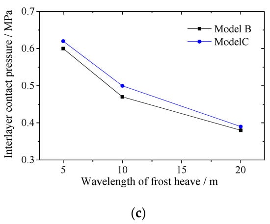 The maximum interlayer contact pressure change in the contact loss area for different wavelengths is shown in Figure 17c. According to the model assumption, only the result between Model-B and Model-C is compared. Figure 17c shows that there is a sharp drop in the interlayer contact pressure as the wavelength increases. In Model-C, for example, the contact pressure drops from 0.62 to 0.39 MPa when the wavelength increases from 5 to 20 m. The divergence in contact pressure between the two models becomes lower as the wavelength increases. The decreasing amplitude of the contact loss area may cause a reduction in contact pressure.