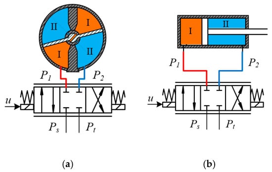 Working principle of electro-hydraulic actuators: (a) rotary type, (b) cylinder type.