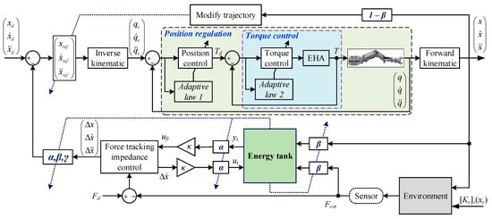 To cope with and achieve human-like behaviors in those possible aforementioned issues, an energy-tank concept-based passivity control was proposed [34,35,36]. This concept is based on the fact that system potential energy is stored in springs or stiffness components (treated as virtual tanks) during the working processes. When the contact-loss or sudden change occurs, the end-effector is still being regulated such that force tracking is satisfied and the energy is released simultaneously; thereby, resulting in unexpected behaviors. Therefore, auxiliary variables are designed to passively detect and switch their states for deactivating force command signals and dissipating the energy when the contact-loss happens. Furthermore, a new trajectory reshaped for smooth and safe operation is also mentioned. This technique was expanded to several fields such as bilateral telemanipulation [37,38,39], surgical robotics [40,41,42], and industrial manipulator applications with variable stiffness [35,36,43]. In [35], Schindlbeck et al. utilized a unified passivity-based force/impedance control based-energy tank to not only deal with the contact-loss but also guarantee the stability and robustness of the KUKA/DLR LWR-III robot. In [36], Toedtheide et al. successfully investigated behaviors of a pneumatic actuator robotic system with unified torque/impedance control-based energy tank.