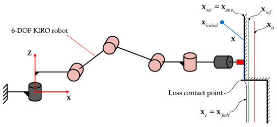 The currently growing attractiveness in fields of industrial applications such as polishing, welding, wiping, assembling, etc. reasonably results in requirements of workability in constrained motions. Following the literature of robotic manipulators in the relevant fields, many scholars proposed methods to improve system performance and reliability such as using force estimation [22,23,24], adaptive laws or intelligent techniques [25,26,27] in terms of tracking performance, or estimation of environment characteristics [28], observers [29,30,31], and impedance behaviors [32,33] for enhancing system reliability. Generally, hybrid position/force control, impedance, and/or admittance controls which are directly involved in force regulation are frequently applied to deal with problems of physical interactions. Despite achieving good outcomes, safety operation of the manipulator in cases of sudden contact-loss due to moving out the constrained framework, step-change of environment, accidentally unloading or payload change is rarely mentioned. Stability, robustness, and especially safety are mandatory requirements when the robot is interacting with the environment.