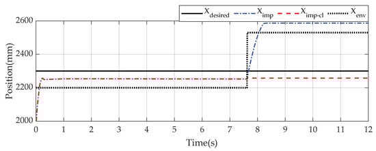 The parameter β changes its value from 1 to 0 after contact-loss happens along with the change in parameter φ and tank variable in Figure 9. The time for switching value of both parameter β is slightly delayed from the time of contact-loss. The reason for this phenomenon is that when contact-loss happens at the time of 7.62 s, the value of the tank variable increases; thus, increasing the value of energy tank T until reaching the upper limitation . When the value of T equals , parameter β is automatically passively switched from 1 to 0, and the trajectory is then faded. The switching of parameter φ occurs when satisfying both two conditions: after contact-loss is detected and condition in Equation (27). It is noticed that the problem of overshoot at the beginning of contact motion is not considered in this study. This problem will be considered as the next step of improvements for safety interactions.