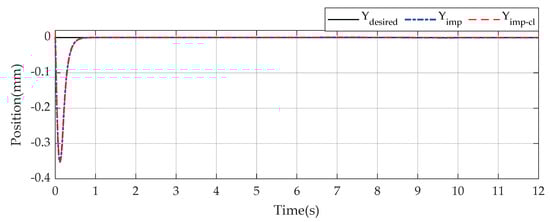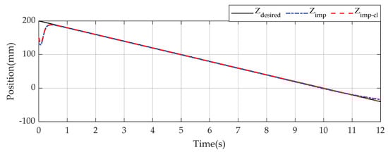 As can be seen in Figure 11 and Figure 12, the tracking performance of the end-effector changes under rippled framework no matter how different values of force control gains are. Due to consideration of the rippled surface, the force tracking effort varies around the desired value of 100 (N). The force tracking effort directly affects position tracking performance. Generally, larger values of the force control gains generate more accurate, faster, and smoother response of the end-effector when contact-loss happens. However, too-large values of control gains (in this case is when the value of is greater than 2) may degrade tracking efforts and execute unexpected motions as a trade-off. As revealed in Figure 12, large gains may result in more overshoot phenomena at the beginning. Additionally, from Figure 12, since all lines reach the upper bound at the same time, the switching parameter β changes its state at the time of approximately 7.63 s, the same as the first case study despite different force control gains.