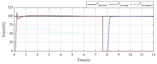 Similar to the second case study, green lines, blue lines, and red lines denote tracking efforts when the force proportional gain is set as , respectively. Among that, dashed line, dashed-dot lines, and continuous lines present the system behaviors when the force integral gains are , respectively.