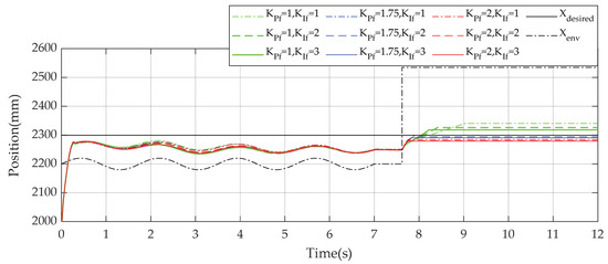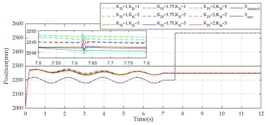 Response of the end-effector in the X-direction under different force control gains.