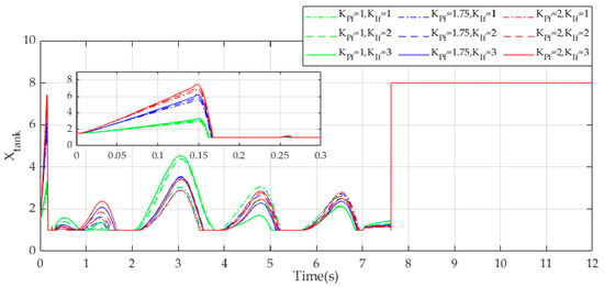 Similar to the first case study, we suppose that the contact-loss happens at the time of 7.62 s. In this case study, only tracking evaluation along the X-direction and response of the virtual energy tank variable are discussed due to similar responses of tracking performances in Y- and Z-directions and other switching parameters. Furthermore, we investigate the end-effector and energy variable behaviors under several different control gains. Herein, we consider nine different control gains and we display them in different line styles. The tracking effort and response of the energy variable are displayed in Figure 11 and Figure 12.