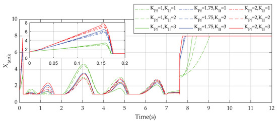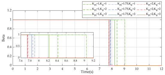 As can be seen in Figure 13, at the time of contact-loss, different values of force control gains result in different responses of the end-effector. Among the two control gains, the proportional gain dominates the tracking performance. Small gains result in slow response but less overshoot at the beginning. On the contrary, large values of proportional gain generally lead to fast response and smoother movement when contact-loss happens. The integral gains can help to enhance tracking performance; however, these gains cannot be arbitrarily set to large values. Figure 14 shows that responses of the energy variable also vary under the rippled framework and different values of the force control gains. Thereby, one can easily deduce that different times for switching the parameter β are obtained due to different times for reaching the upper bound of the energy variable as shown in Figure 15 (the parameter β switches if and only if the energy variable reaches the upper bound). Therefore, the control gains should be carefully designed in the case of friction as one considerable factor to achieve better performance.
