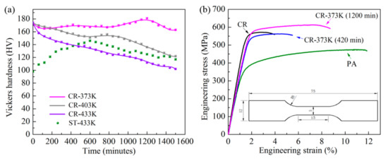 Figure 1a shows hardness curves of CR samples aged at 373 K, 403 K and 433 K. Before aging, the hardness of the CR samples was 174 V. It can be seen that during the aging process at 433 K, the hardness decreased continuously with the aging time. After aging for 1500 min, the hardness of the alloy decreased from 174 HV to approximately 102 HV, a decrease of approximately 41.38%. During the aging at 403 K, the hardness of the alloy decreased smoothly. After aging for 1500 min, the alloy hardness decreased from approximately 174 HV to approximately 122 HV, a decrease of approximately 29.89%. When aging at 373 K, the hardness value peaked twice. At the beginning of the aging process, the hardness of the alloy decreased and the first hardness peak, at 420 min, had a value of 171 HV. The hardness then decreased and gradually increased after fluctuating. The hardness of the samples reached a second peak (181 HV) after 1200 min of aging and then decreased. Tensile results are shown in Figure 1b. After PA treatment, the ultimate tensile strength (UTS), yield strength (YS) and elongation to failure (Ef) were 475 MPa, 350 MPa and 11.8%, respectively. Figure 1b shows that the UTS, YS and Ef of the CR samples were 571 MPa, 528 MPa and 4.2%, respectively. For the CR-373K (420 min) samples, the UTS and YS decreased to 544 MPa and 484 MPa, respectively, whereas the Ef increased to 5.4%. It is worth noting that the UTS, YS and El significantly increased to 614 MPa, 564 MPa and 8.7% for the CR-373K (1200 min) samples compared with the CR samples.