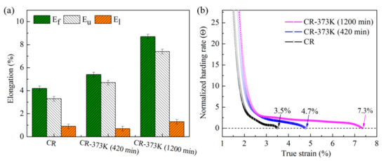 Based on the engineering stress-strain curve in Figure 1b, measuring the plastic strain increments before and after the peak stress resulted in the uniform elongation (Eu) and local elongation (El) of the tensile specimen in Figure 2a. Figure 2a shows that the Ef value of the tensile specimen was mainly contributed by Eu. In contrast, the El values contribute little. In general, the Eu value was employed to characterize the uniform deformation capability of a material, which could be determined using the Considère criterion [12] (where is the true stress and is the true strain). As shown in Figure 2a, the CR samples had the lowest Eu value (3.3%). With prolonged aging, the Eu value increased gradually and the Eu value of the CR-373K (1200 min) samples was 7.4%. Moreover, the uniform deformation capability or Eu value of materials was directly related to the work-hardening rate, which was determined by the formula [12]. When > 0, dislocations could be further stored during deformation and then work-hardening occurred. When < 0, deformation mainly occurred in a local area, which caused the alloy to enter the necking stage. Continued deformation broke the alloy. In the work-hardening rate curves of Figure 2b, the CR-373K sample had a higher than the CR sample. In the CR-373K (1200 min) samples, the value was still >0 when the true strain was >7% but the values of the CR samples at true strain >3.5% were <0.