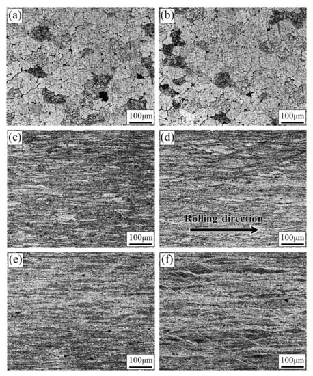 Figure 3a,c,e and Figure 3b,d,f show the longitudinal and transverse sections of the PA, CR and CR-373K (1200 min) samples, respectively. Figure 3a,b show that the microstructure of the PA samples contained equiaxed grains with an average size of 150 μm. Figure 3c,d shows the morphology of the CR samples and the principal microstructural characteristic was the presence of a typical fibrous structure. Compared with the PA sample boundaries, the grain boundaries had a low contrast and the microstructure displayed a low contrast overall because many dislocations were introduced into the matrix. As no recrystallization occurred, the microstructure after aging was almost the same as those of the CR samples.