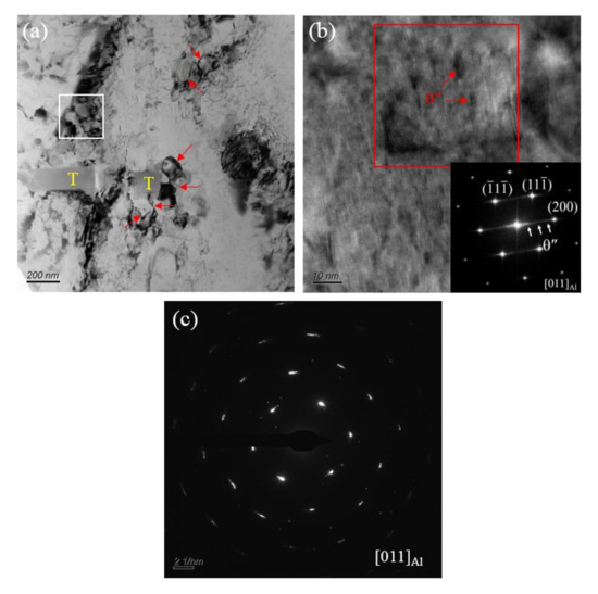 Figure 5 shows the microstructures of the CR-373K (420 min) samples. When the CR samples were aged at 373 K for 420 min, the high dislocation density was recovered. On the other hand, precipitates preferentially nucleated and grew rapidly in areas where the dislocations were heavily tangled. However, the precipitates in severely deformed alloys were difficult to identify owing to their size and high contrast of defects (white frame in Figure 5a). Therefore, high-resolution transmission electron microscopy (HRTEM) was used to characterize the morphology of the precipitates (Figure 5b). As shown in Figure 5b, fine precipitates (red arrows) formed at this stage. The corresponding Fourier transform patterns (insert in Figure 5b) clearly show an additional diffraction pattern at the {200}Al position, indicating that the fine precipitates were θ″ phases, which was consistent with the results in a literature report [22]. In addition, the average width and length of θ″ phases were only approximately 0.2–3 nm and 4–10 nm, respectively. The density of the θ″ phase measured by HRTEM was o ~6 × 1014 m−2. Compared with the CR samples, these samples had more ultrafine grains, the grain boundaries were clearer (red arrows in Figure 5a) and the grain size remained almost unchanged (~150–200 nm). At the same time, the continuity of the SAED patterns (taken along the <110> zone axis) had further increased indicating that the misorientation between the refined structures had increased (Figure 5c).