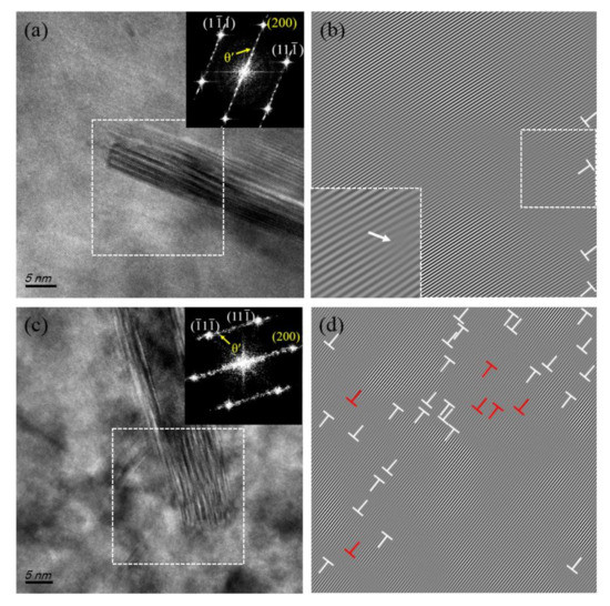 HRTEM micrograph of the CR-373K (1200 min) samples before (a) and after fracture (c); inset is the Fourier transform patterns taken from the white wireframe; (b) corresponding IFFT pattern of (a) with lower dislocation density (marked by “T”); (d) corresponding IFFT pattern of (c) with higher dislocation density. Red dislocations “T” represent the introduction of dislocations into the θ′ precipitates.