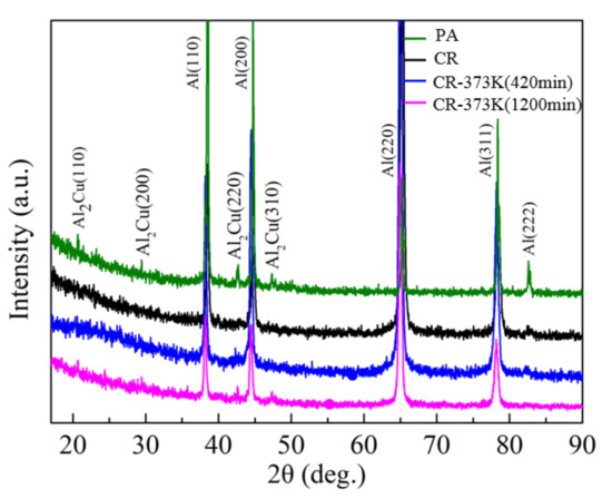 Based on the XRD patterns in Figure 8, the dislocation density of the CR and CR-373K samples was calculated by the Williamson–Hall method [15] and shown in Table 1. As shown in Table 1, the dislocation density of the CR-373K samples was reduced compared with that of the CR samples as a result of recovery caused by aging. For example, the dislocation density in the CR samples was 1.4 × 1015 m−2 while the dislocation density in the CR-373K (420 min) and CR-373K (1200 min) samples were 5.0 × 1014 m−2 and 3.9 × 1014 m−2, respectively. In addition, a θ′-Al2Cu precipitate peak with increased intensity was observed in the CR-373K samples (Figure 8). The relative intensities of the peaks in the CR-373K (1200 min) samples were higher than those in the CR-373K (420 min) and CR samples, indicating that the density of θ′-Al2Cu in the CR-373K (1200 min) sample was higher, which was consistent with the TEM results in Section 3.2.2.