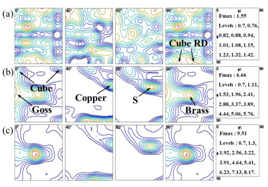 Orientation distribution functions (ODFs) of the Al-Cu-Mn alloy: (a) PA; (b) CR; (c) CR-373K (1200 min).
