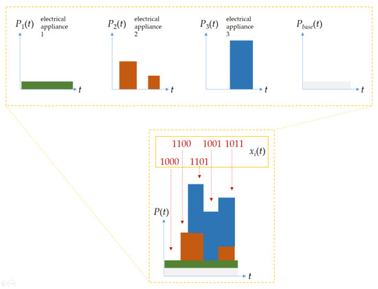 Figure 2 illustrates the principle of combinatorial search for load combinations with xi(t) in Equation (2) for load disaggregation, which aims to optimize load combinations by xi(t). In Figure 2, Pi(t) represents the assumed power demand of the i-th electrical appliance. xi(t) associated with Pi(t) is represented as a binary vector, evolved through metaheuristics, and used to minimize Equation (2) (the minimal error, err(t), to be obtained for load disaggregation) between the summation of superimposed absorptions Σxi(t)Pi(t) with an unmonitored base load Pbase(t) and the total load P(t) (P(t) to be approximated from a pack of Pi(t) with Pbase(t)). A metaheuristic algorithm, GA, is suitable for load disaggregation formulated in Equation (2) (the objective metric is the metric we are trying to optimize and the fitness metric is the algorithm’s guide to doing so), where concerned electrical appliances are recognized by parallel computing accelerated GA for the declared objective metric. Concerned electrical appliances are constant or time-varying resistive, inductive, or capacitive loads.
