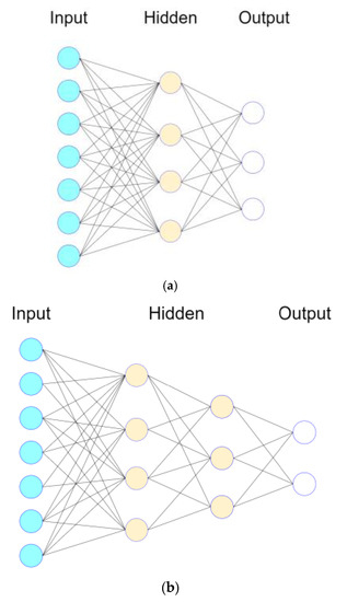 Representative ANNs, connectionisms, mimicking biologic NNs: (a) A connectionism is fully connected; (b) A connectionism considers dropout—one of the hyperparameters whose specified value is used to control the learning process of a connectionism—to prevent overfitting [28].