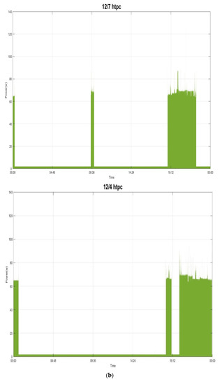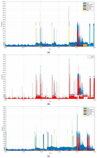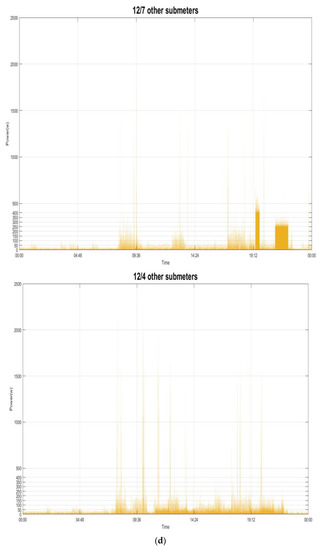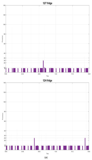 In this section, experiments are carried out to verify the validity of the investigated NIALM, by a publicly available UK-DALE (UK Domestic Appliance-Level Electricity) dataset [32]. The UK-DALE dataset contains records of power consumption measured and collected from five different households in the UK. In each house, the authors in [32] recorded both whole-house power consumption (power demand) from the mains every 6 s and power consumption by concerned individual electrical appliances every 6 s. Figure 6 shows the considered historical power demand on two typical days (Sunday 7 December 2014 (Figure 6a,b) and Thursday 4 December 2014 (Figure 6c,d)) in House 1 from the UK-DALE dataset, which is considered, parsed, and used to experimentally validate the performance of the investigated methodology in load recognition. The summarization of the UK-DALE dataset can be found in [32]. In Figure 6a,c, we show the total power demand in the mains. Also, we show the power demand by the concerned individual electrical appliances and all other submeters [32] considered together and treated as a single individual in power absorptions for load disaggregation. As shown in Figure 6b,d, the thin white gap between the power demand in the mains and the summed-up power demand illustrates the amount of power demand, base load, which is not concerned/metered. The concerned electrical appliances, including the considered submeters as a single individual in power absorptions to Pi in Equation (2), are listed in Table 1; their power demand is shown in Figure 6 and the base load, Pbase in Equation (2), is assumed to have a constant value of 150.0 watts for simplicity’s sake. Figure 7 shows the power demand of the several individual electrical appliances targeted in this paper and listed in Table 1. The behavior of the power demand by the electrical appliances can be found in [32]. For example, Figure 7a shows the power demand by the fridge running and doing its respective job of compressor on (state 1: its mean power consumption is ~90.0 watts with a standard deviation of ~44.0) or defrost (state 2: its mean power consumption is ~245.0 watts with a standard deviation of ~16.0). In this paper, the load classes considered from the targeted electrical appliances in Table 1 and recognized are shown in Table 2.