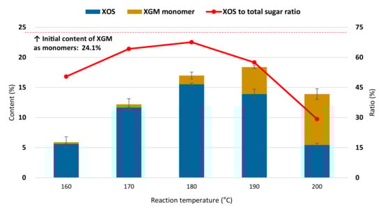 As the reaction temperature increased, the content of monomeric XGM dramatically increased due to the excess hydrolysis of hemicellulose (Figure 1). Meanwhile, XOS content was maximized at 180 °C (15.5%). Similar to the XOS content, the highest XOS to total sugar ratio was achieved at the same reaction temperature (180 °C). Therefore, an appropriate reaction temperature for improving the XOS ratio in the liquid hydrolysate could be found for SSB.