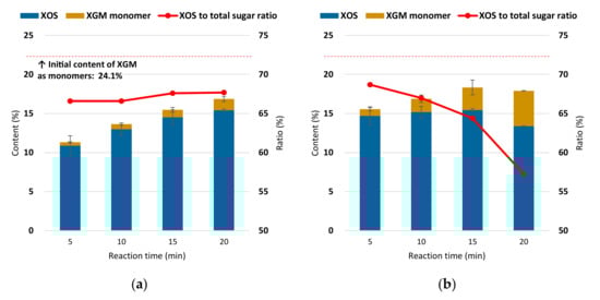 Although a good maximum XGM content was obtained at 190 °C than at 180 °C, the results of the XOS to total sugar ratio are quite different between the two conditions (Figure 2). In the cases of 180 °C, the XOS to total sugar ratio was constant even though the reaction time was changed (Figure 2a). Meanwhile, the ratio showed a sharp decrease as the reaction time was extended to 20 min at 190 °C (Figure 2b). Although 180 °C for 20 min showed the highest XOS content (15.4%), this condition could not guarantee the highest level of XOS to total sugar ratio (67.7%). Therefore, 190 °C for 5 min might be considered as the best point for XOS production from SSB due to the high content of XOS (14.7%) and high purity (XOS to total sugar ratio: 68.7%) than other autohydrolysis conditions.