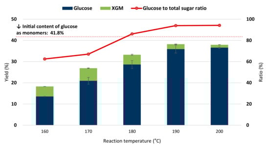 The cellulose fraction in the solid residues after autohydrolysis was hydrolyzed to glucose by an enzyme cocktail (Figure 3). According to the sugar composition in the liquid hydrolysate, a small amount of glucose was released regardless of the changes in the reaction temperature (Table 1). However, the glucose yield after enzymatic hydrolysis showed an increasing trend with increasing reaction temperature. The glucose to total sugar ratio presented a similar trend with the glucose yield corresponding to the reaction temperature increase. Thus, the maximum glucose yield (36.6%) and glucose to total sugar ratio (94.2%) were obtained at 200 °C.