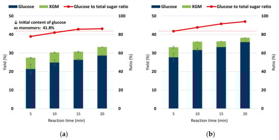 The glucose yield was improved by extending the reaction time under both reaction temperature conditions (Figure 4). In addition, the glucose to total sugar ratio was maximized at 20 min, but the results were slightly different between the 180 °C (86.2%) and 190 °C (93.9%) conditions. However, it was revealed that a condition with a high glucose to total sugar ratio does not ensure a high XOS to total sugar ratio by comparing the results of the previous section.