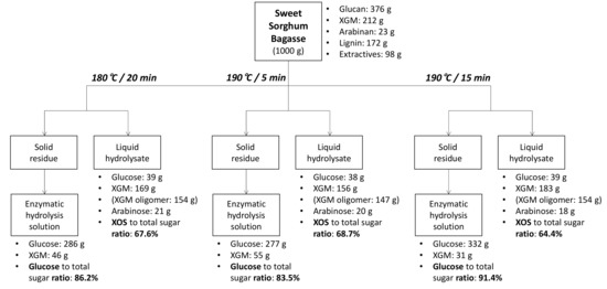 The chemical composition of SSB showed good potential for XOS production (Table 1). It had a high amount of xylan, and a low amount of ash and other hemicellulosic sugars. In particular, a very tiny amount of galactan and mannan in SSB has been reported in previous studies [,]. Therefore, the XGM monomer in the liquid hydrolysate can be considered as xylose alone, and the XGM oligomer implied XOS in this study.