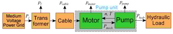 where Q is the required flowrate; H is the hydraulic head defined from H-Q characteristic of the pump from the catalogue; g is the acceleration of gravity; ρ is the density of a liquid; Phydr is the hydraulic power of the pump; Pmech is the input mechanical power of the pump, f(Q) is its dependence on Q obtained from the catalogue; ηpump is the pump efficiency; ηmotor is the motor efficiency; pcable is the electrical loss in the cable; pT is the electrical loss in the transformer.