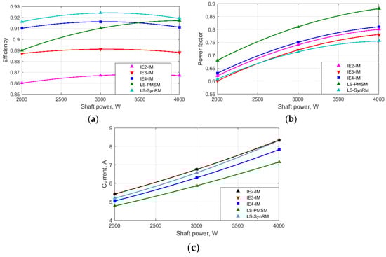 Motor characteristics vs. motor shaft power: (a) efficiency; (b) power factor; (c) current.