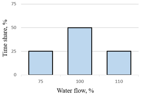 According to reference [], in this study, a duty cycle (flowrate versus time) was assumed for the system that is typical for centrifugal pumps with an uncontrolled speed and approximately constant flowrate. In practice, even in the case of fixed-speed pumps, the required flowrate rarely remains constant. For instance, even for the simplest pumping application, when a pump moves fluid from one tank to another, the pump operating point will vary as the level of water in the tank also changes. Therefore, the pump does not operate at the best efficiency point all the time. Figure 4 shows the assumed operating cycle for a pump with approximately constant flowrate, according to [].