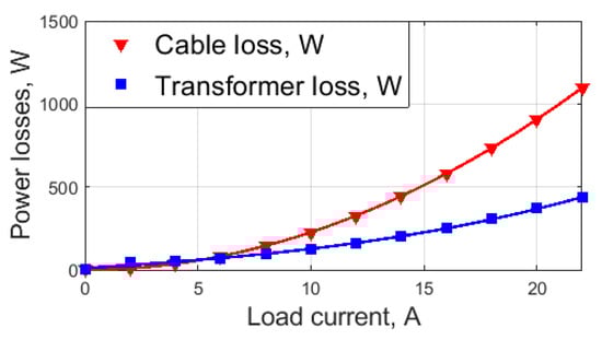 For industry, the typical cable length for connecting low-voltage power equipment is about 0.1 km []. Many low-voltage feeders operate with loads that exceed those planned for the initial design and are close to the maximum allowable load due to the inevitable increase in consumer energy demand in 10–20 years and the delayed process of the upgrade of transmission lines []. Considering this fact, in low-power electrical facilities with a current load of up to 24 A, three-phase cables with PVC insulation and with a cross-section of 2.5 mm2 are can be used []. The specific resistance of one phase of a copper cable with these parameters is approximately ρcable = 7.55 Ohm/km. The reactance in the calculation of stranded cables of small cross section is usually neglected. The phase resistance of such a cable will be Rcable = Lcable∙ρcable = 0.1 7.55 = 0.755 Ohm. Losses in the cable are calculated from (3). The losses in the transformer with the parameters of 400 V and 16 kVA are calculated based on the manufacturer’s data as []: