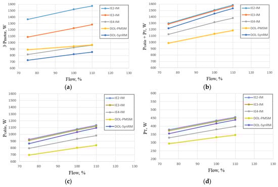 Power losses at three points of the pump duty cycle with various flows: (a) motors; (b) cable + transformer; (c) cable; (d) transformer.