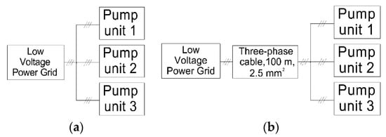 Results based on Equations (1)–(12), for three different cases (Figure 8) are presented in Table 6, Table 7 and Table 8. For ease of comparison, in all cases, the results of the energy consumption of the pumping station consisting of three motors (denoted as “x3”) are presented. The structure shown in Figure 8c illustrates the power supply of a typical pumping station []. The number of the pump units in one pumping station can be different, usually it is 3 or more. The structures in Figure 8a,b are simplified models of the structure in Figure 8c without taking into account the losses in the supply cable and transformer (Figure 8a) and taking into account only the losses in the cable, without taking into account the losses in the transformer (Figure 8b). The simplified structures are considered to assess the impact of the cable and transformer losses on the results of the comparison of electric motors of various types.