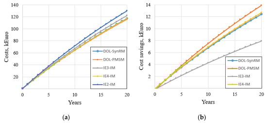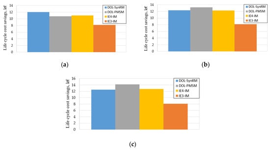 As seen in Figure 9, the IE3 IM provides a life cycle cost savings SLCC of 8.1 k€ with respect to the IE2 IM. However, the amount of savings (8.1 k€) for the IE3 IM is the same for all three considered cases m = 1–3 since the losses in the cable and transformer for the IE3 IM and the IE2 IM differ little (Figure 7). If the losses in the cable and the transformer are not taken into account (first case, m = 1), the savings are greater for the DOL SynRM than for the DOL PMSM and the IE4 IM. Thus, the lifetime savings for the DOL SynRM are12 k€, that is 1.2 k€ higher than for the DOL PMSM; 1.0 k€ higher than for the IE4 IM; and 3.9 k€ higher than for the IE3 IM (Figure 9a).