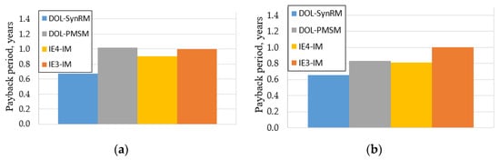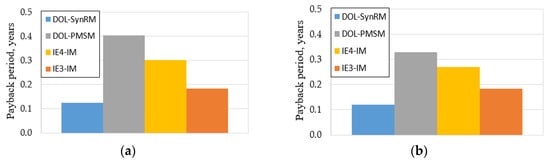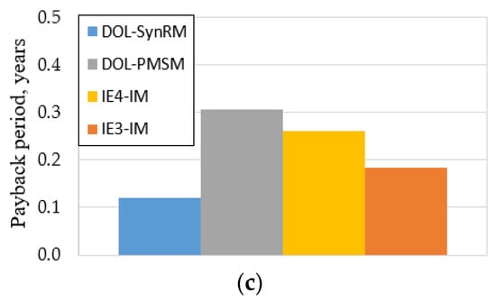 One could see that when the losses in the cable and the transformer are taken into account, the use of motors with a higher power factor becomes more profitable since the payback period is reduced. Thus, for m = 1, that is excluding cable and transformer losses (Figure 12a), the DOL PMSM payback period is 1.02 years. However, for m = 2, which means including the cable losses (Figure 12b), the payback period is 0.83 years. Moreover for the third case, m = 3, including losses in the cable and the transformer (Figure 12c), the payback period is even lower, 0.78 years. This is due to the increase in the absolute values Eyear and Cyear, when taking into account the losses not only in the motor but also in the cable and the transformer.
