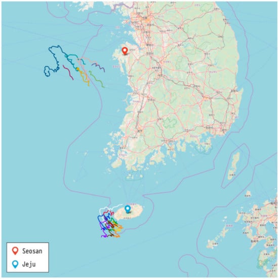 Our previous study [8] used data obtained from Seosan, located on the west coast of South Korea. For this work, we added new data obtained from Jeju Island to the previous data. Hourly data from 2015 to 2016 at these locations were used for our study. We used this to predict the hourly locations of drifters in this study. Figure 1 shows the observed trajectories from the two locations in 2015, and Table 1 shows the features related to the start and end points of trajectories of the sample data. The height of the wind velocity above the ocean was 10 m, and its spatial resolution was 900 m.