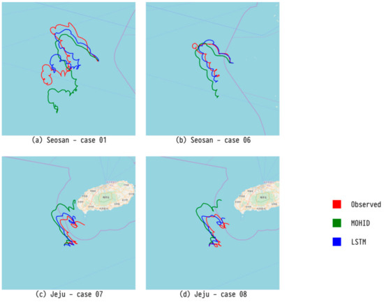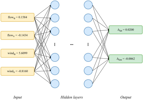 We extended and improved our previous study [8] which predicted the trajectories of drifters using evolutionary computation, and we also predicted the trajectories of drifters using various machine learning techniques [44,45,46,47,48,49]. To the best of the authors’ knowledge, this was the first trial in which machine learning has been applied to the prediction of drifter trajectories, and it significantly improved upon the representative numerical model, MOHID.