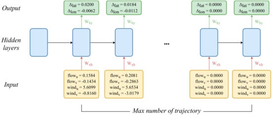 Recurrent neural network (RNN): the connection between units is characterized by a circular structure [38] and can be used when continuous data is given. RNNs can be used to predict trajectories since the movement of a drifter is sequential data. The input data for MLP or DNN has a fixed size of 4, as depicted in Figure 2. However, RNNs should incorporate all the drifter moves in sequence; thus, the data length can be different. The maximum length that the model can receive as an input sequence is set, and the remaining data space is padded with zero. For example, if the maximum length is set to 200 and given data set has 120 h of movement information, the remaining data is filled with 80 zeros. Figure 3 shows the input and output data structure of the RNN model.