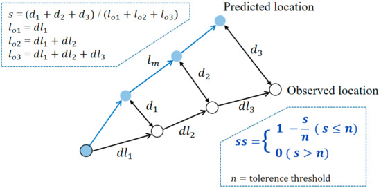 NCLS is a measurement method that is quite frequently used in trajectory modeling and it is proposed to solve weaknesses in the Lagrangian separation distance in relation to the continental shelf and its adjacent deep ocean. The error of each location is calculated in MAE, whereas NCLS calculates errors by cumulative calculation. Figure 4 shows the calculation process of NCLS. In this process, if s becomes too large, the skill score may continue to remain zero. If the tolerance threshold n is set high, this can be solved to some extent. In this study, we set n to 1 since errors sufficient to make s relatively large did not frequently occur.