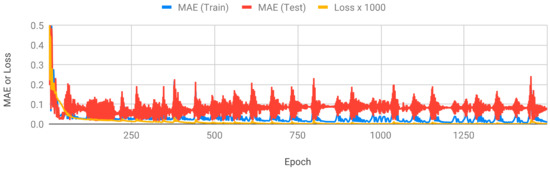 The loss function measures the difference between the correct answer of the training data and the value predicted by the model, which may not relate to MSE and NCLS. In order to identify whether or not loss and MAE are related to each other, we examined several neural network models. Neural networks learn the values of the weights to reduce loss, and a reduction of MSE can prove worthwhile. We investigated the loss according to epoch, MAE, and MAE of the test data in the three deep learning methods, CNN, RNN, and LSTM. From Jeju data, Case 1 was used as the test data, and the rest were used as training data. Figure 5 shows the results of DNN.